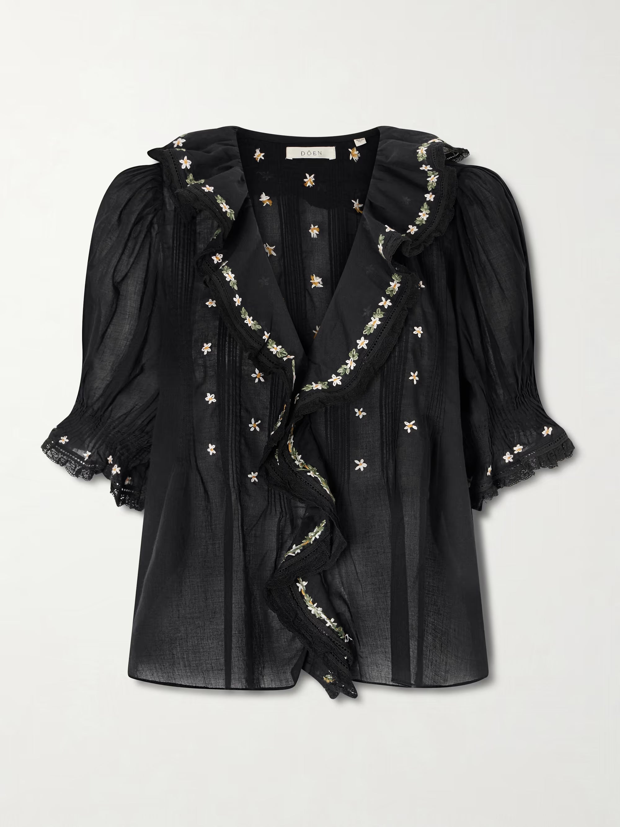 Dôen Hettie Black lace-trimmed embroidered organic cotton-voile blouse